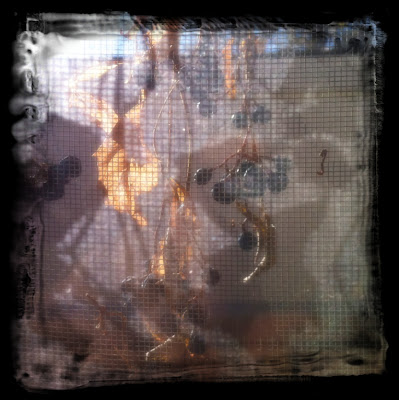 Woke up to this sight hanging outside the window this morning. Faded vines with berries hanging on, shadows, screen... iPhone nearby, a bit of Photoshop and voila!
